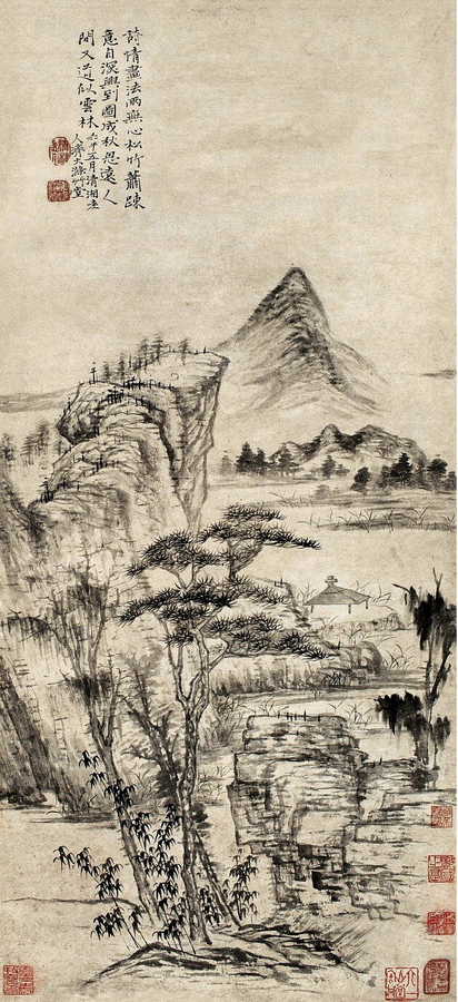 ④ 석도(石濤, 1642–1707) <산수도> 1702, 종이에 먹, 86.5×39cm, 개인(2014년 상해 경매서 920만 위안(한화 15억 7천만원)에 낙찰.